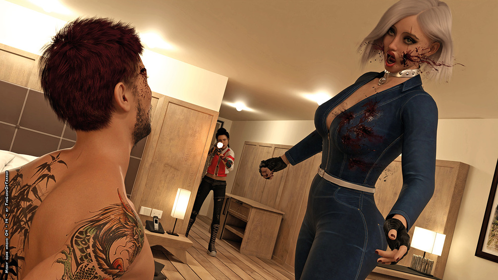 Tthe female yakuza breaks into the room where her friend is getting tortured, but she will find hard resistance by the white haired bodyguard and the boss, but somehow she will manage to take them out. After that the male yakuza will have his revenge against the blonde that dragged him there…